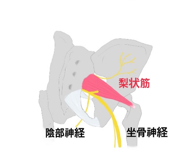 イラストのように、骨盤の後ろから下方へ陰部神経が伸びていますが、すぐ横に「梨状筋」という筋肉があります。